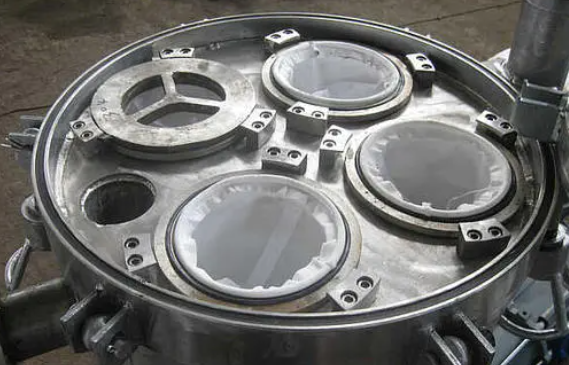 多袋式過濾器是一種壓力式過濾裝置,主要的結(jié)構(gòu)組成部件為過濾筒體、過濾筒蓋和快開機(jī)構(gòu)、不銹鋼濾袋加強(qiáng)網(wǎng),工作時濾漿用泵打入壓力容器內(nèi),通過濾袋進(jìn)行過濾。過濾時因為濾袋直徑比籠架大,壓濾時濾袋緊貼籠架。截獲的固相顆粒牯附在濾袋表面上形成濾餅,通過濾袋過濾后的濾液排出殼體。